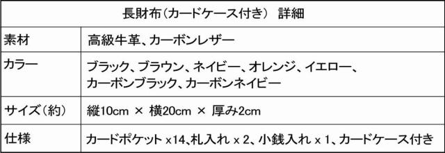 仕様:カード入れ x 12、フリーポケット x 2、札入れ x 2、小銭入れ x 1、カードケース付き(カード5枚収納可)