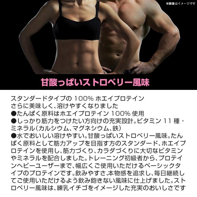 | 商品詳細 | スタンダードタイプの100%ホエイプロテイン さらに美味しく、溶けやすくなりました ●たんぱく原料はホエイプロテイン100%使用 ●しっかり筋力をつけたい方向けの充実設計。ビタミン11種・ミネラル(カルシウム、マグネシウム、鉄) ●水でおいしい溶けやすい。甘酸っぱいストロベリー風味。 たんぱく原料として筋力アップを目指す方のスタンダード、ホエイプロテインを使用し、筋力づくり、カラダづくりに大切なビタミンやミネラルを配合しました。トレーニング初級者から、プロテインヘビーユーザーまで、幅広くご使用いただけるベーシックタイプのプロテインです。飲みやすさ、本物感を追求し、毎日継続してご使用いただけるよう飲み飽きない風味に仕上げました。ストロベリー風味は、練乳イチゴをイメージした充実のおいしさです |