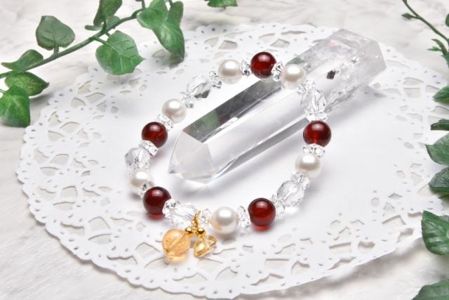 | 特徴・意味 | 真紅のベルベットのようなオレンジガーネットの深い赤と、高貴な純白の貝パールを組み合わせ、高級感溢れる一品に仕上げました。落ち着いた大人の雰囲気の中、大ぶりのスターカット水晶が煌めきをプラス。どこか色気すら感じさせる雰囲気が、縁結びや恋愛成就など、恋のお守りとなってくれます。更にチャームで2種のシトリンを加えることで、金運アップにも期待できる一品です。 【オレンジガーネット】 オレンジガーネットは、正式にはヘソナイトガーネットと言い、豊富なカラーバリエーションのあるガーネットの中でも、グロッシュラーガーネットに分類されます。含有されたマンガン分と鉄分により、黄色やオレンジ色褐色を示すもの。シナモンストーンとも呼ばれます。 グロッシュラー・ガーネットの中でも、マンガンと鉄分によりオレンジ色に色づいたものをヘッソナイトと呼びます。 赤みが強いものをシナモンストーン、やや褐色がかったものはヒヤシンス等と呼ばれる事もあります。 オレンジガーネットはガーネットのグループの中でも特に肉体的なエネルギーを持つ石です。生命力を高め、肉体と精神の両面に対して強くパワ—を与えます。 【水晶】 水晶は「浄化、開運、願望成就、魔よけ」などの意味があります。 スピリチュアルな点では、「心を清める、肉体を清める、魂の純粋化」という意味があり、水晶の透明さ、純粋無垢な輝きは「パワーストーンの王様」とも言われる。水晶のような「清らかさ」は、今私たちにも求められている。 無色透明、純粋無垢な水晶のパワーは絶大です。 |