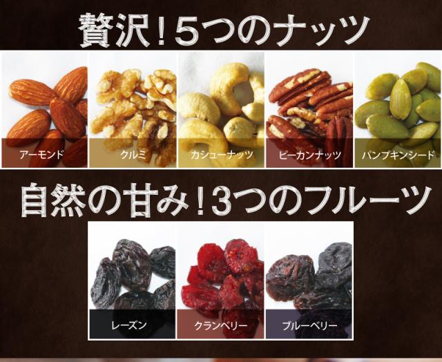 自然の恵みである5つのナッツ(アーモンド・クルミ・カシューナッツ・ピーカンナッツ・パンプキンシード)と3つのフルーツ(レーズン・クランベリー・ブルーベリー)をミックスしました!