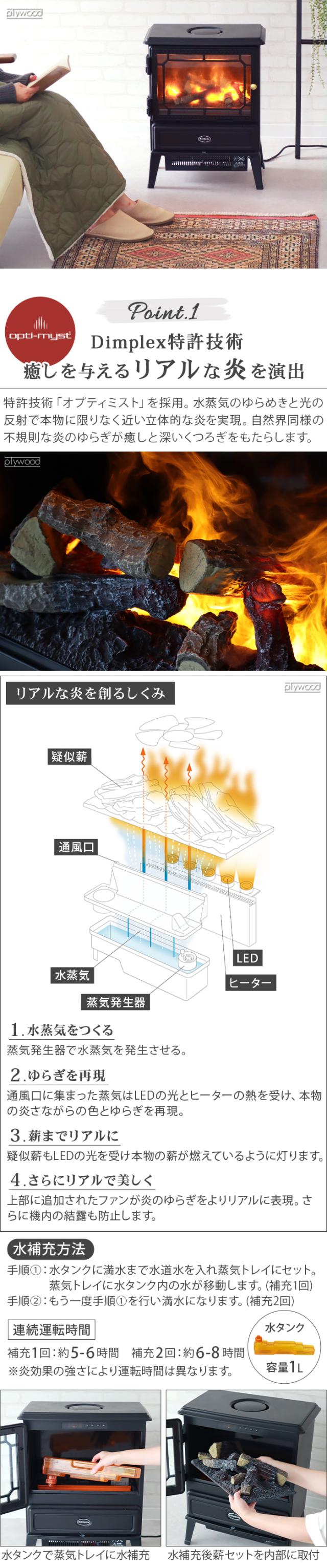 1949年イギリスで創業した世界的電気暖炉メーカー「Dimplex(ディンプレックス)」から、「Opti-myst」シリーズの電気暖炉のご紹介です。「Opti-myst」は独自の特許技術により「電気の光」と「水蒸気」を利用し、本物さながらの炎を実現。また、薪サウンド機能により、薪の爆ぜる音までも再現。視覚・聴覚からの癒しに加え、ひんやりする足元から暖めてくれるファンヒーターが極上のくつろぎ時間を提供します。