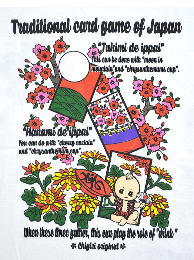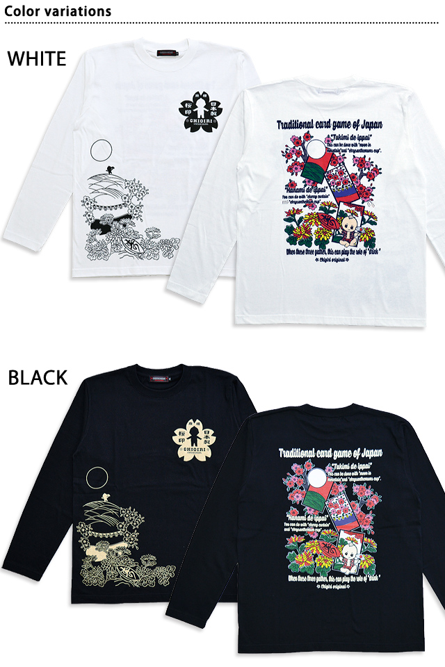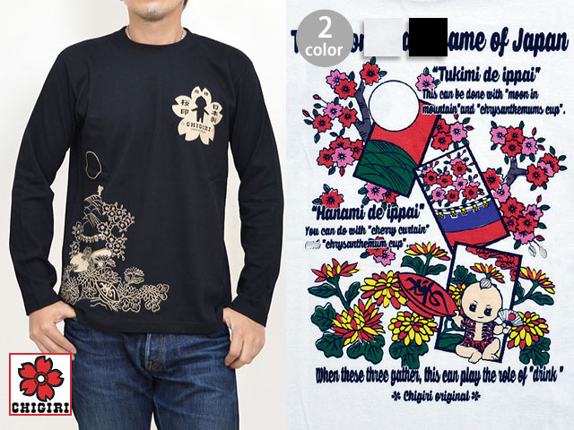 CHIGIRIさんから、「花見で一杯長袖Tシャツ(CHL31-593)」のご紹介です。 CHIGIRI×花札の人気シリーズから新柄が登場しました! 背中には、花札と花札の絵柄をダイナミックに組み合わせてプリント。 バックにしっかり柄を入れている分、フロントはシンプルにデザインし、メリハリを付けました。 ボディーには、綿100%のさらりとした肌触りの薄手なTシャツ生地を使用。 | ||||||||||||||||||||||||||||||