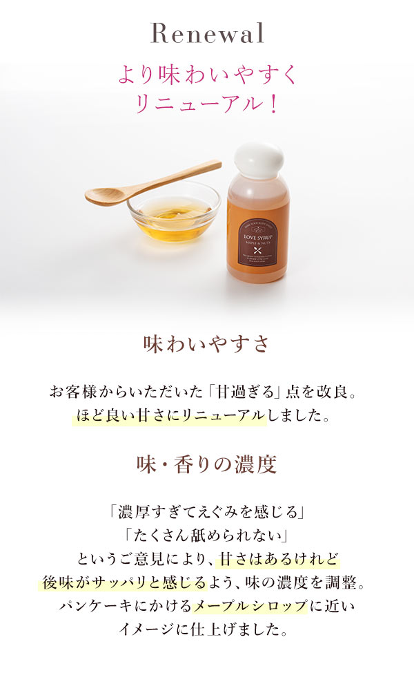 ハチミツよりもあっさりした感覚だったので、これをもとに試作を繰り返しました。その結果、完成したのが食べれるローション『ラブシロップ メープル&ナッツ』です。