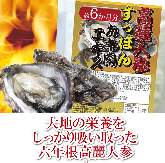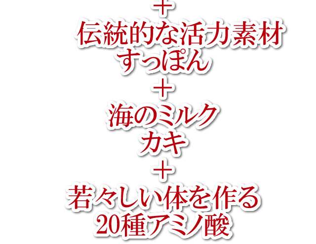 大地の栄養をたっぷり吸い込んだ 「 六年根高麗人参 」 ・伝統的な活力素材 「 すっぽん 」 ・海のミルク 「 カキ 」 ・若々しさをサポート 「 20種アミノ酸 」 ・アンデスの秘宝 「 マカ 」 ・守る力をサポート 「 霊芝 」 ・ネバネバパワー 「 ヤマイモ 」 が ………