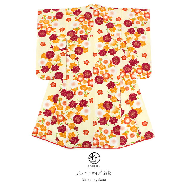 着物 単品 小学生 ジュニア 薄黄色 クリーム 赤 橙色 紅葉 梅 長襦袢付 重衿付 祝い着 振袖 卒業式 十三参り 十三詣り 女の子 キッズ 仕立て上がり
