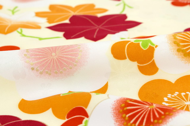 桜の舞う地模様の生地に、紅葉に梅が咲く、可憐で可愛らしい柄ゆきです。