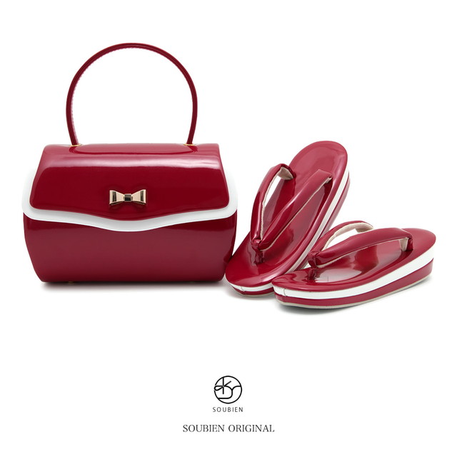 草履バッグセット 成人式 振袖用 袴用 創美苑オリジナル 赤 レッド 白 リボン エナメル シンプル 二枚芯 卒業式用 フォーマル用 【フリーサイズ】