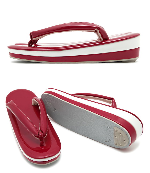 草履の天と鼻緒、前坪・バック共にエナメル加工の素材となります。