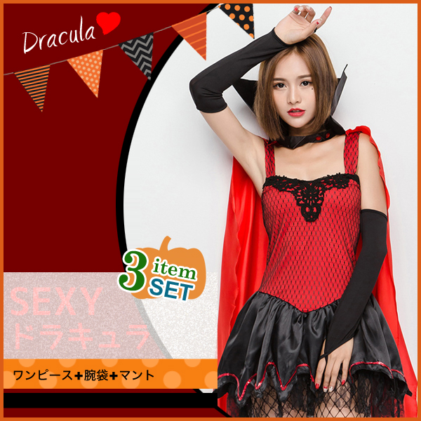 [即納] コスプレ ドラキュラ ガール コスチューム レディース 大人 衣装 仮装 ワンピース 手袋 マント 3点セット