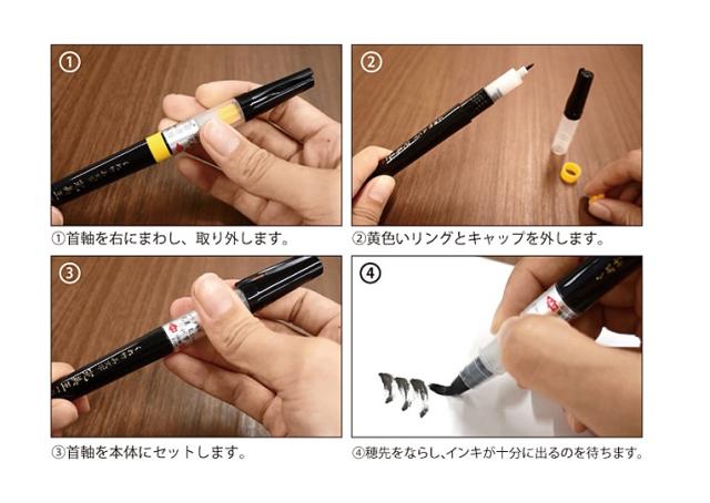 (従来型筆ペンは、本体を押してインキを出していましたが、完美王はカートリッジ式で自然にインキが流れる仕組みです)