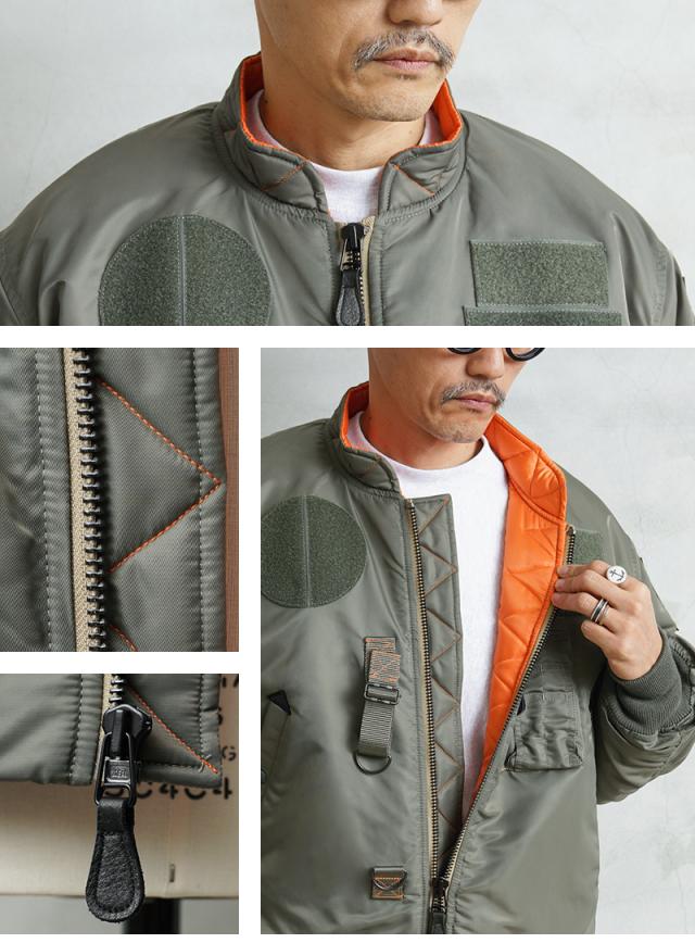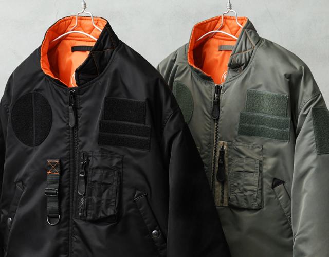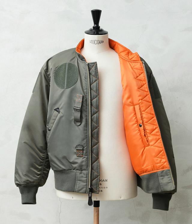 本作では、MA-1の象徴である重厚なナイロンシェルや立体的なアームホール構造といった“実物の芯”はそのまま再現。