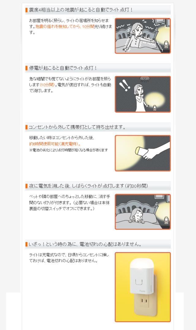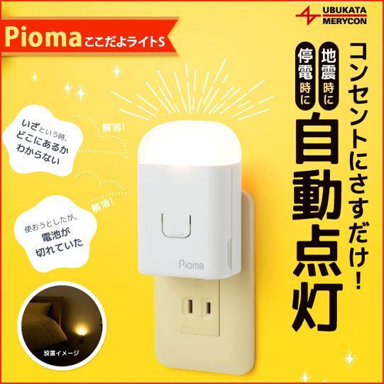 ライトの光源には0.4W のLED を使用しています。色は暖かみのある電球色となっています。災害時を想定し、混乱を少しでも和らげられればという想いを込めました。◇フットライト『ピオマここだよライトS UGL3-W』は、地震や停電時に暗くなったお部屋を自動的に明るく照らします。コンセント差込式だから電池切れの心配もありません。消灯時などフットライト・足元灯として。地震・停電 時に自動点灯。