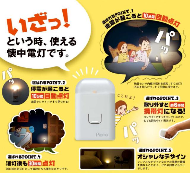 2009 年にリリースされた「ピオマ ここだよライト」を実際に使われたお客様のご意見を反映しました。多くの方に安心をお届けするためにも、さらに使いやすくなった防災用ライトを作りました。いつ発生するかわからない災害に備えておきたい灯り。いざという時にすぐに灯りの場所がわかり、すぐ次の行動にうつせる…「ピオマ ここだよライトS」はそんな暗闇の不安を解消した防災用ライトです。