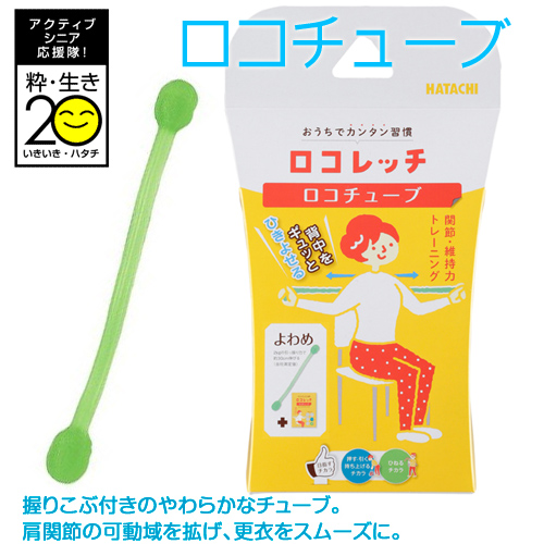 ◇『ロコチューブ』は、両端を握り、力いっぱい引っ張るエクササイズができます。肩関節の可動域、上腕金、背筋、腹筋の筋力向上に効果的で、物の持ち上げ、更衣をスムーズにします。