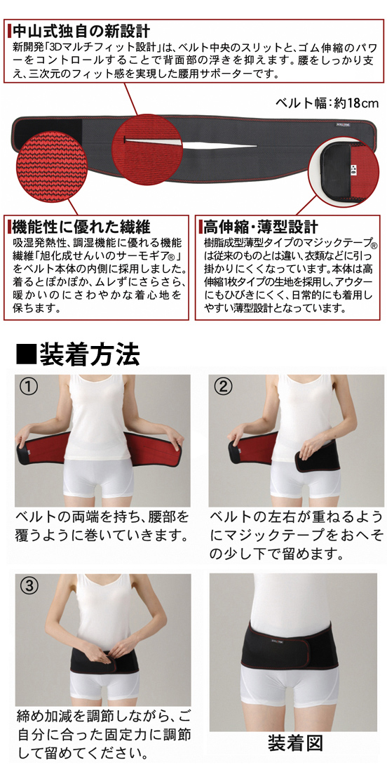 ◇「中山式ボディフレーム腰用フィット」は、3Dマルチフィット設計(意匠登録申請済)【意匠登録第1427207号】は、ベルト中央のスリットとゴムの伸縮強度を上下切り替えることで背面部の浮きを抑え、日常生活の様々なシーンで快適な装着感が得られます。