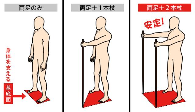 2本のポールを持つことで、身体を支えるための接地面(支持基底面)が拡がり転倒を防止。安定感のある歩行が可能となります。