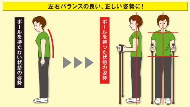 1本杖で歩くと身体のバランスが左右どちらかに傾いてしまいがちですが、2本杖で両側から身体を支えると、左右のバランスが均等になり、正しい姿勢を保って歩くことができます。