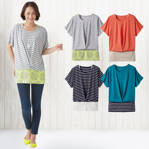 ・ボーダーと無地、ボーダーと花柄の重ね着風がおしゃれな1枚です。