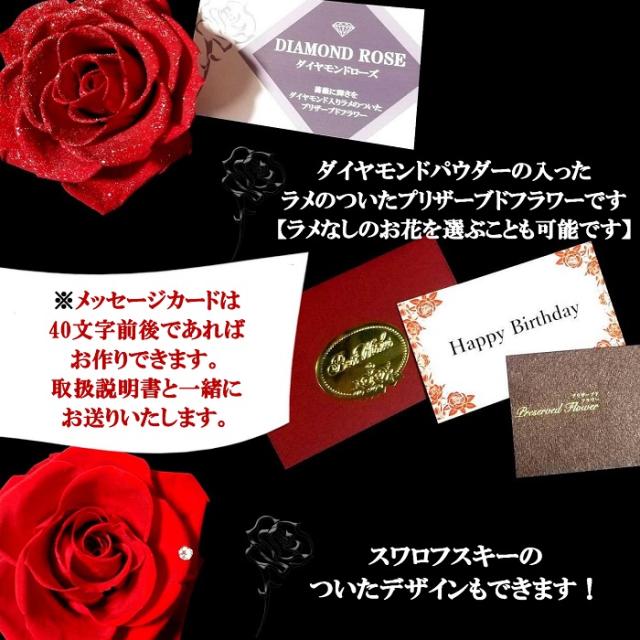 - プレゼント用にプリザーブドフラワーの薔薇を注文し今届きました。店主の花や花束へ思いが無料オプションで表れ、買った方の早く届けたいとの気持ちも対応の早さで伝わってきて信頼して買い物出来ました。 プレゼ...