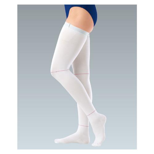 ●足首部分は24hPa(18Hg)の圧迫圧で、脚の形状に合わせた立体構造とSigel理論に基づいた圧迫圧と圧迫勾配設計により、臥床・安静時の静脈還流をサポートします。●ラテックスを一切使用しないソフトな肌触りで、足首と膝にポジショニングマーカー入。●股下丈タイプで、大腿部シリコーンによりずり落ちを軽減します。●モニターホールから血行状態が観察できます。