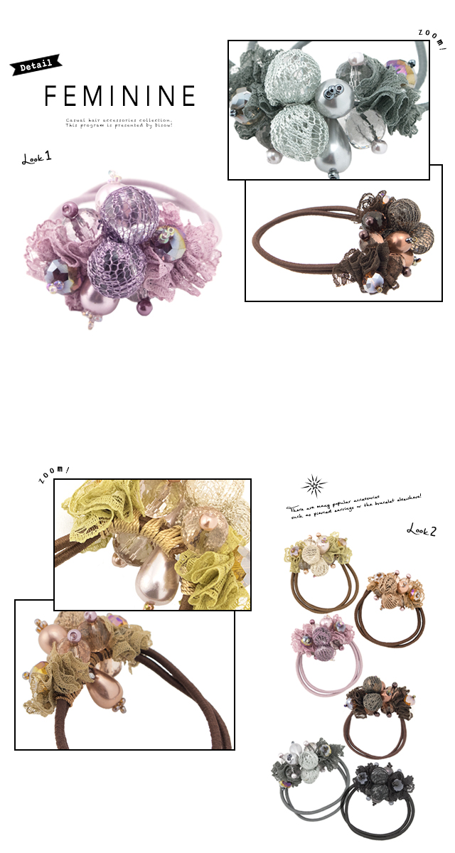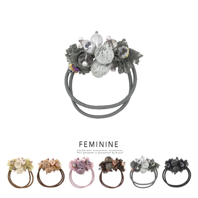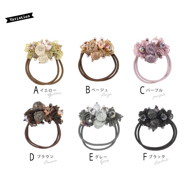 【ガーリーなレースとビーズがキュートなスモーキーカラーヘアゴム】大人/上品/オフィス/ヘアアクセサリー
