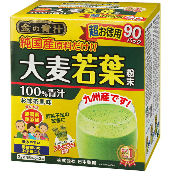 金の青汁 純国産大麦若葉 90包 *日本薬健/純国産大麦若葉100%/収穫から24時間内に加工/鮮度保持/お抹茶風味の青汁/青汁特有の青臭くないスッキリした味/食物繊維/ビタミン/ミネラル/豊富な栄養素/野菜不足改善