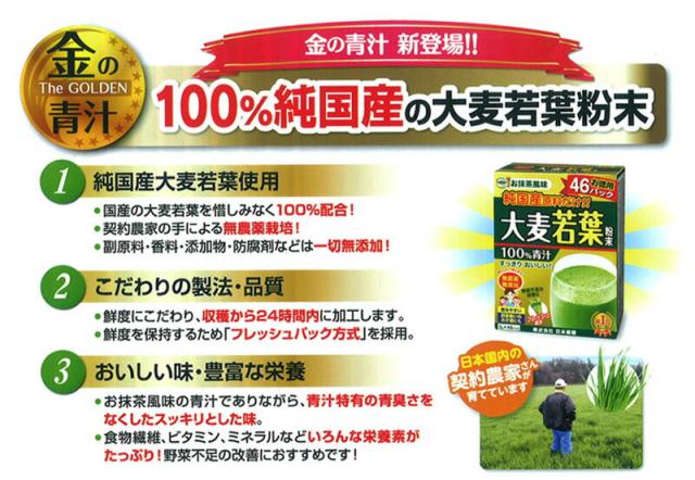 「金の青汁 純国産 大麦若葉 粉末100% 青汁 3g×46包」は、収穫から粉砕加工まで24時間以内に行い、フレッシュパック方式(脱酸素充填)で新鮮なおいしさをお届けする大麦若葉青汁です。大麦若葉には実をつけるための栄養が貯えられ、味もクセがなく美味しいことから青汁原料として親しまれています。この大麦若葉をまるごと粉砕した粉末には、食物繊維やビタミンE、鉄などが入っているため野菜不足の改善にもおすすめです。牛乳・豆乳を入れて、ヨーグルト・パンケーキ・スープにまぜて、アイスクリームにかけてなどアレンジしてもお召し上がりいただけます。純国産原料のみ使用の100%青汁です。