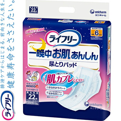 ライフリー 一晩中お肌あんしん尿とりパッド 夜用スーパー 男女共用 6回分 22枚 *ユニ・チャーム/尿しっかり閉じ込め逆戻り低減/お尻さらさら/ムレず安心/尿量多い方たっぷり吸収/寝た姿勢でもおしりすっぽり後ろモレ防止