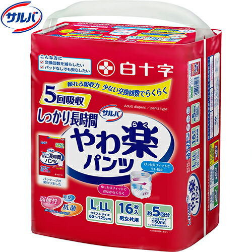 サルバ Dパンツ しっかりガード長時間 5回分 L-LLサイズ/ウエストサイズ80-125cm 16枚 *白十字/おしっこ5回分/歩ける方・座れる方/介護用おむつ/普通の下着と同形状/使用者が自身で上げ下げ可能な紙おむつ/しっかり吸収/素肌と同じ弱酸性
