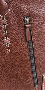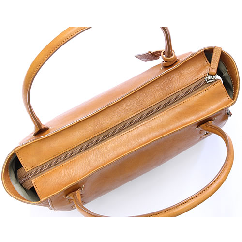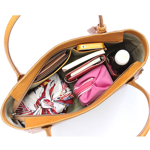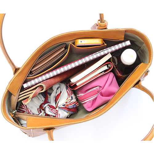 大きすぎず、普段使いにはちょうどよいサイズです。見た目よりも収納力があるので、すっきりと持ち物を整理できます。シンプルなデザインの中にナチュレのクロスレザーとステッチがアクセントになっています。