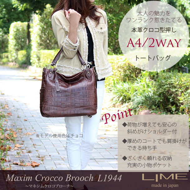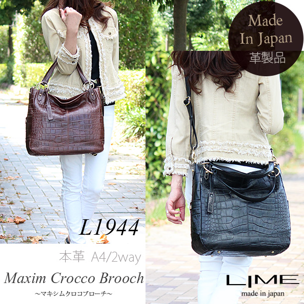 トートバッグ レディース 本革 2ウェイ 2way ショルダーバッグ ショルダー ななめ掛け 斜め掛け 通勤 通学 A4 a4 ビジネスバッグ ビジネス 日本製 クロコ 型押し 革 牛革 レザー バッグ ライム マキシムクロコブローチ L1944 大容量 大き目 高級 上品 ブランド クリスマス