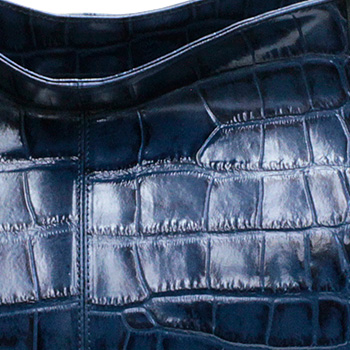クロムなめしのソフト牛革、通常の皮の厚みを1.2ミリ程まで割り加工し薄くした後、クロコダイルの腹部の艶出した型押しを施し、薄いソフト感を演出しています。