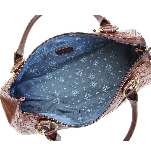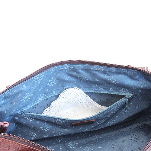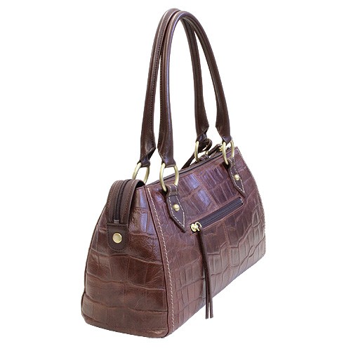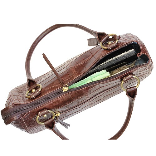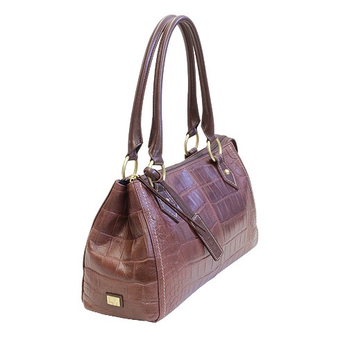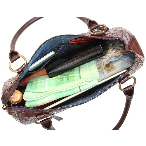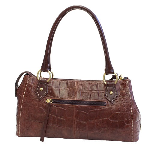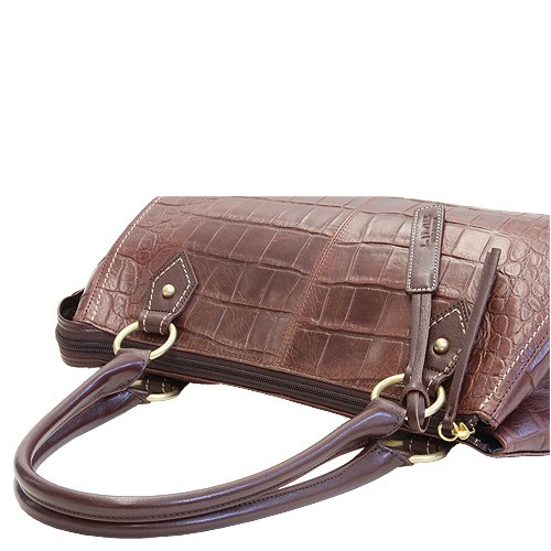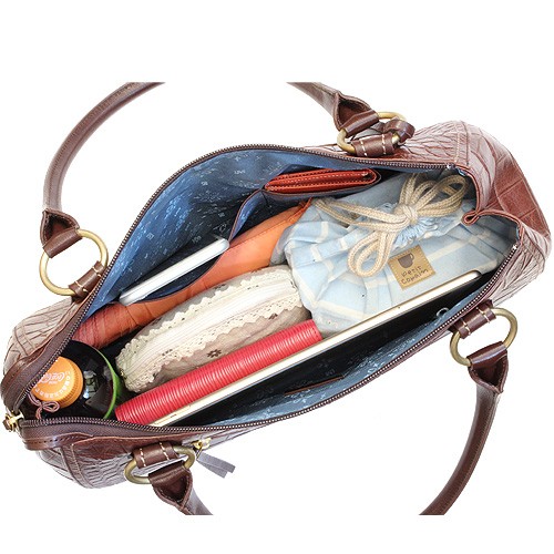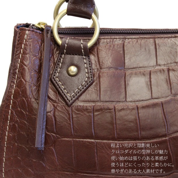 美しい陰影が魅力の華やかなクロコ型押し素材に、意外にたっぷり入る収納力、又肩にかけられる絶妙な持ち手長さが魅力のポイント。
