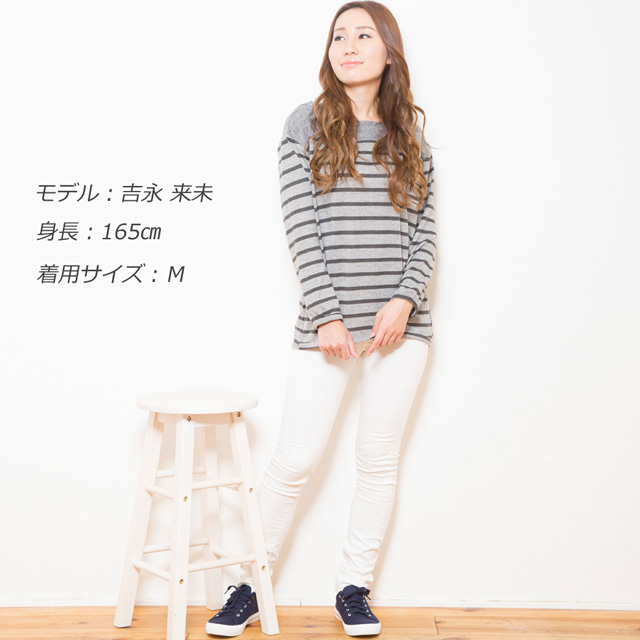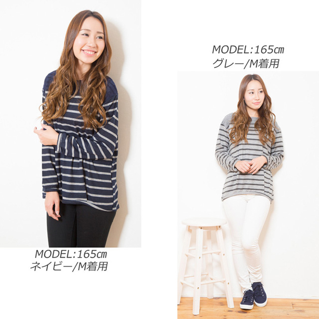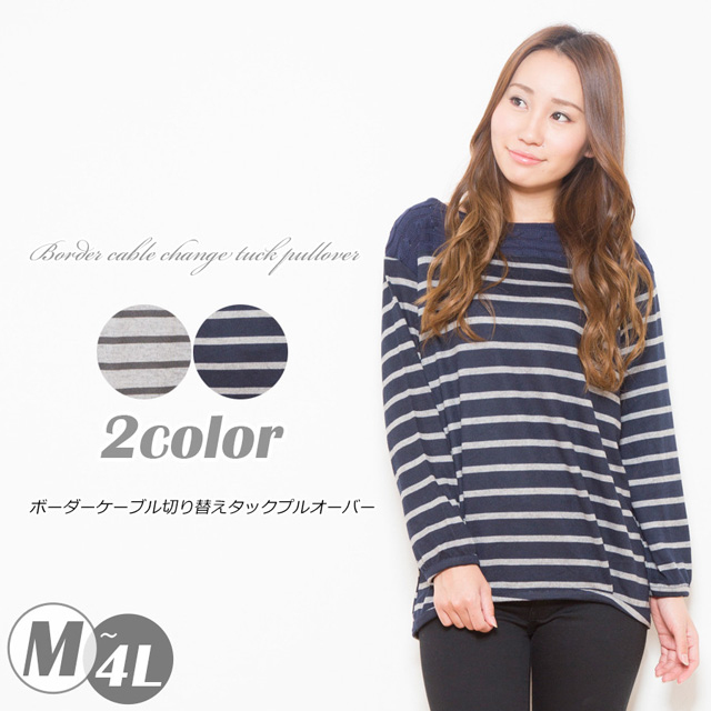 | コメント | オシャレなボーダー柄、長袖カットソー。肩部分はケーブル編み切替で大人可愛いデザイン。普段使いやお出かけ用に最適。ゆったりシルエットで窮屈感なく着用できます。 |