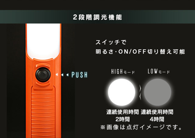 広い範囲をしっかり照らす約120°の広配光で、明かりをしっかり届け、2段階調光機能で作業場所に合わせた調光を選べます。