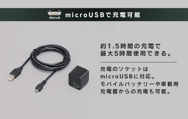 ■micro USB充電…お手持ちのUSB充電器、モバイルバッテリー、車載用充電器がお使いいただけます。給電しながら使えます。
