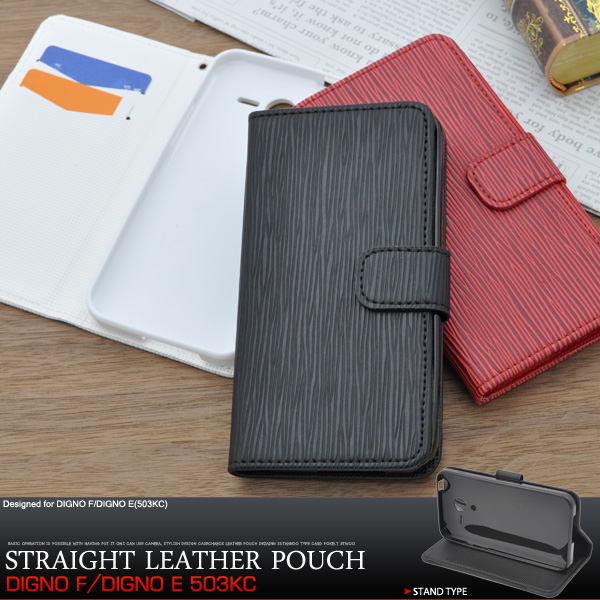 ストレートレザーデザインのDIGNO F/DIGNO E(503KC)用スタンドケースポーチ。 衝撃やキズなどからDIGNO F/DIGNO E(503KC)を守ります。また、内部はソフトケースなので着脱が簡単です。 落下防止に便利なストラップホール付きです。 横開きタイプなので、手帳のように使うことができます。また、内側に2つのカードポケットが付いています。※DIGNO F/DIGNO E(503KC)は付属しません。※ライセンス商品ではありません ※カードは付属しません。