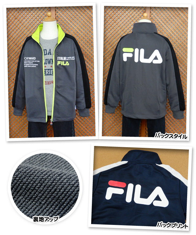 | 特長 | ・FILA(フィラ)・スタンドネックジャケット・フルジップ ・ロゴプリント・配色切替 ・タグ装飾・ポケット2P・子供用 ・男の子 |
