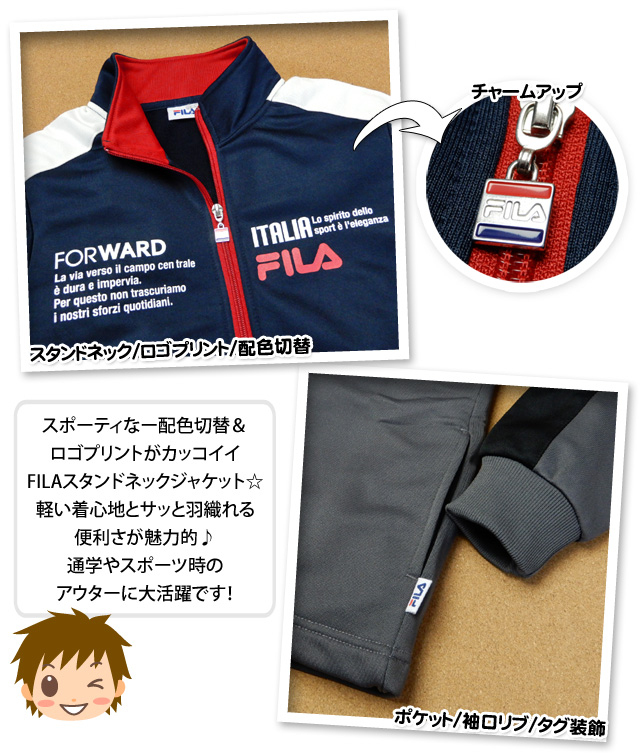 | コメント | スポーティなー配色切替&ロゴプリントがカッコイイFILAスタンドネックジャケット☆軽い着心地とサッと羽織れる便利さが魅力的♪通学やスポーツ時のアウターに大活躍です! |