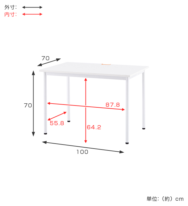 | サイズ | 約 幅100×奥行70×高さ70(cm) 内寸:[足元空間]幅87.8×奥行55.8×高さ64.2(cm) その他:[天板]厚み1.8/切り欠き幅9.4×奥行4(cm) |