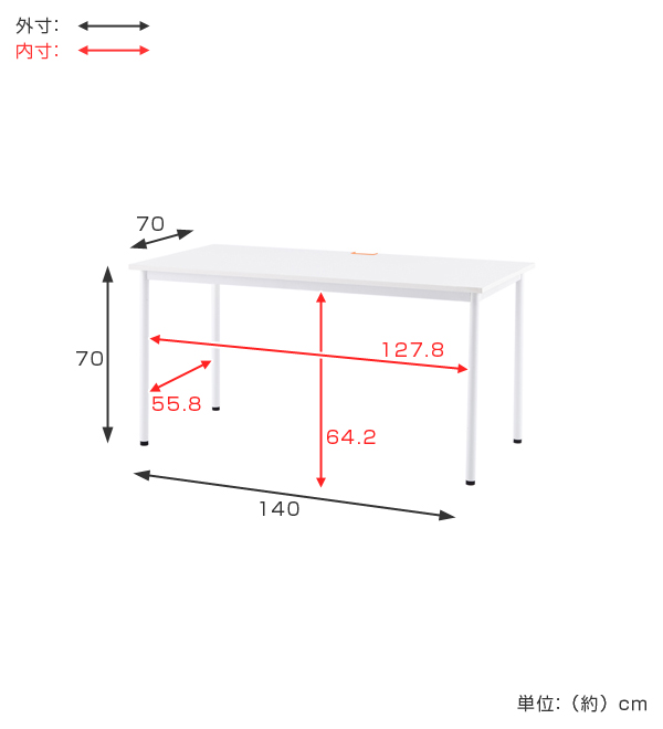 | サイズ | 約 幅140×奥行70×高さ70(cm) 内寸:[足元空間]幅127.8×奥行55.8×高さ64.2(cm) その他:[天板]厚み1.8/切り欠き幅9.4×奥行4(cm) |