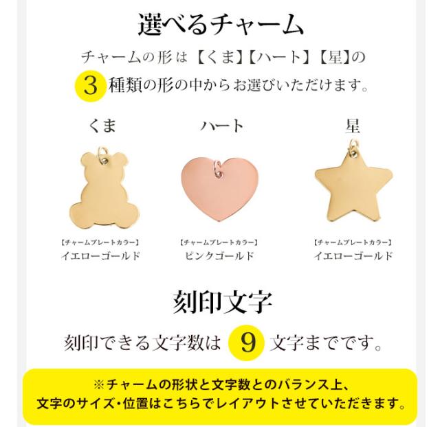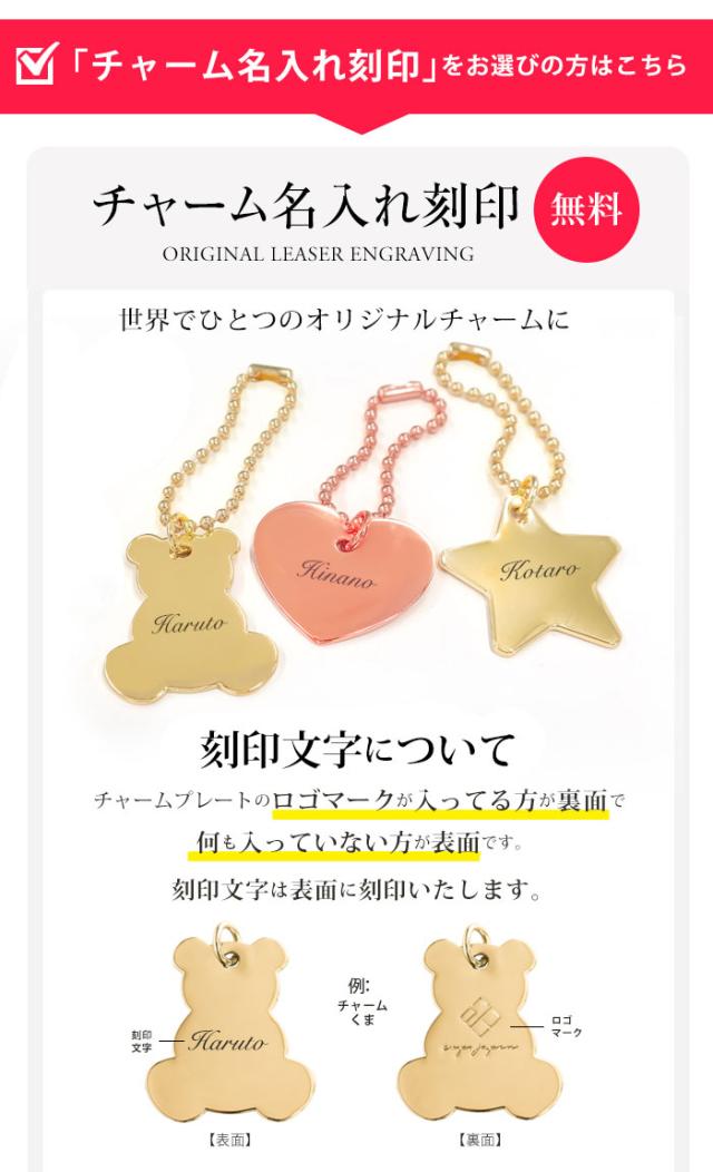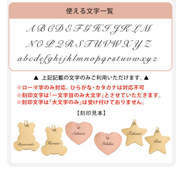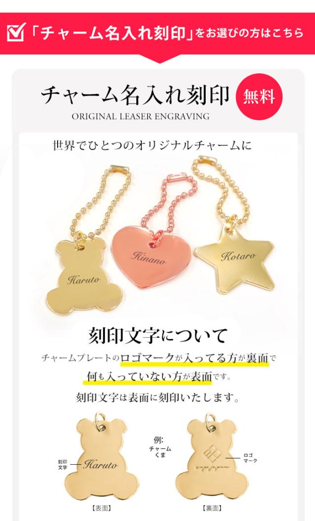 - ストロベリーを注文、画像通りのかわいい色でした。 チャームのネームは、おしゃれな感じで満足です。 まだ孫に見せてないけど、気に入ってもらえそう。