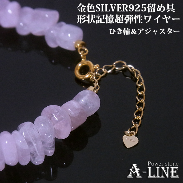 クンツァイト(さざれ)8〜10mm・SILVER925ひき輪&アジャスター(金メッキ仕様)、形状記憶超弾性ワイヤー、ワンプッシュ(真鍮製金メッキ処理)