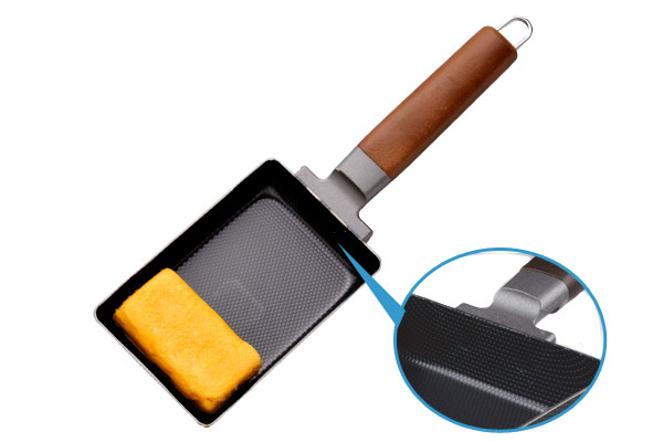 ●表面に無数の凹凸を浮き立たせた特殊加工金属を施した卵焼き器です。