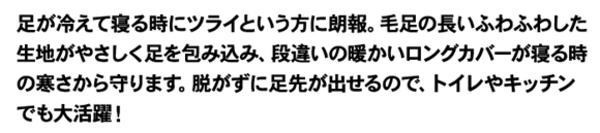 足が冷えて寝る時にツライという方に朗報!毛足の長いふわふわした生地がやさしく足を包み込み、段違いの暖かいロングカバーが寝る時の寒さから守ります。脱がずに足先が出せるので、トイレやキッチンでも大活躍。厚みがあるから、更にふんわりあったか。毛足の長い素材が、暖かい空気層を作り、閉じ込めるため、履いてすぐ実感できます。・ふわふわの肌ざわり、段違いにあったかい・足が出せるのでスリッパが履けます・暑いときには足先を出してムレ防止・締めつけすぎないゆったり設計【適応サイズ】足:23.0〜25.5(cm)、太もも周り55cmまで/片足:170g【個装サイズ】縦27・横23・厚み11(cm)/355g【材質】ポリエステル100%【原産国】中国