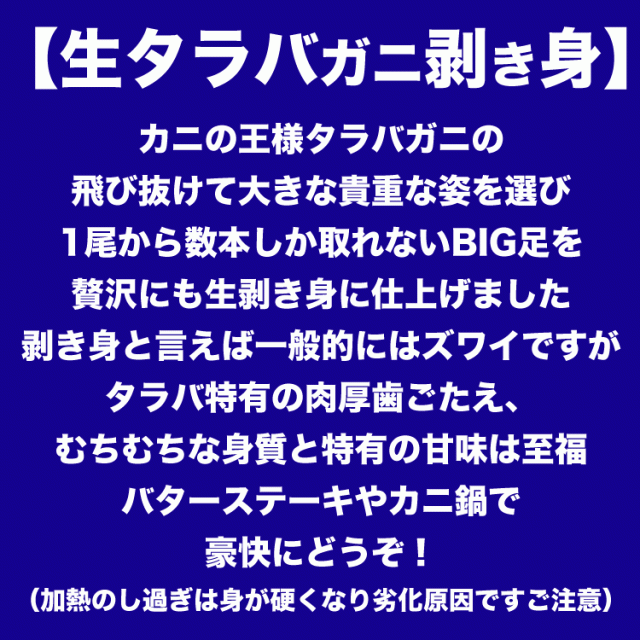 たらばがに(ロシア産、カナダ産、アメリカ産、他)/酸化防止剤(V.C、亜硫酸塩、クエン酸)、ポリリン酸Na