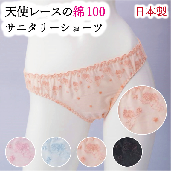 (関連ワード)ショーツ 綿100% サニタリーショーツ 綿100 ショーツ 綿 日本製 レディース フルバック M L 大きいサイズ 単品 可愛い 天使柄 エンジェル柄 レース かわいい 下着