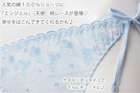 かわいいエンジェルをあしらった綿100%の紐ショーツ(紐パン)になります。両サイドの紐はほどいて調節が可能ですので、締め付けから解放してリラックスショーツやふんどしパンツのように履いていただくことが出来ますよー。(^^♪