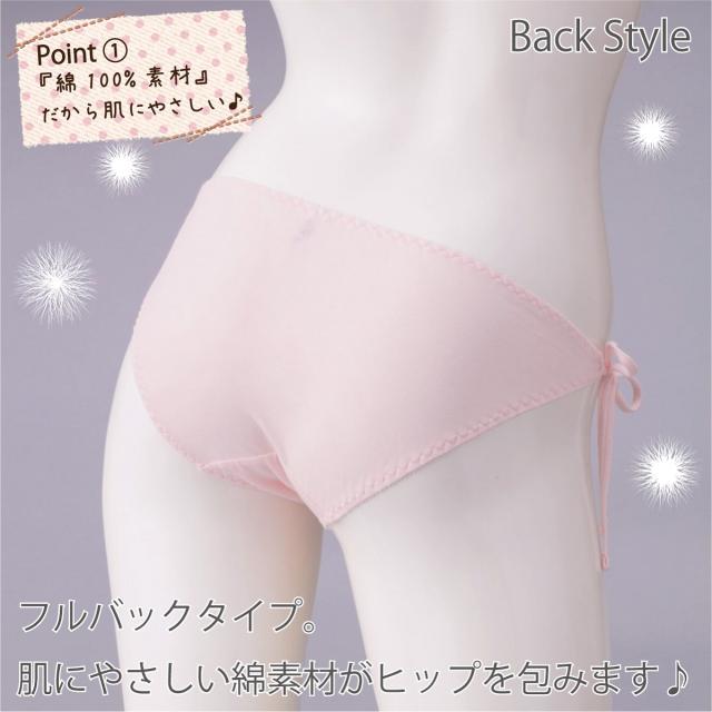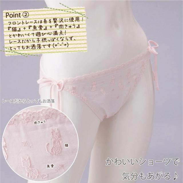 | 猫柄レースがかわいい♪ 肌にやさしい綿100%サイドリボンショーツ(紐パン) | ||||||||||||