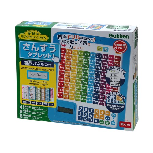 ロングセラーの知育ボードをコンパクトに持ち運びができる形態にリニューアルしました。いつでもどこでも遊びなが学習できます。これひとつで、「たしざん」「ひきざん」「かけざん」「わりざん」の学習ができます。最初の学習では、数の概念を理解しやすいように、絵を使ってたし算・ひき算の仕組みが覚えられるシートも付きました。「もんだいモード」付きで、繰り返し何度でも問題を解くことができます。問題は全部で438問を収録、また、計算機機能と、液晶を使って、ご家族の方やお子様ご自身で問題を作る遊びもできます。繰り返しやることで、自然と算数の力が身に付きます。できなかったときの励ましや、できたときの褒め言葉など、達成感を感じる工夫がいっぱい。お子様のやる気を育てる知育玩具です。